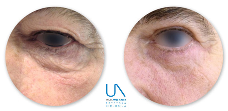 Operacija je ambulantna in navadno poteka v lokalni, redko splošni anesteziji. Po izrezu kože sledi izrez orbikularne mišice, pod katero je vezivni septum. Z majhnimi rezi pristopimo v dva predelka, v katerih je maščevje. Sledita natančen izrez in prerazporeditev maščobe. Zatem natančno ustavimo krvavitev in zašijemo kožo. Če povešena solzna žleza povzroči oteklino na zunanjem delu zgornje veke, lahko napravimo dvig žleze. Po operaciji sta prehodno vidni oteklina in podplutba. Oteklina se v prvih dneh po operaciji ob ustreznem hlajenju hitro zmanjša, podplutba pa lahko traja do štirinajst dni. Šive navadno odstranimo po tednu dni. Brazgotine v obliki tanke črte so malo opazne.