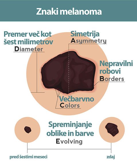 Nikakor pa ne odlašajte z obiskom dermatologa, če opazite sumljivo kožno spremembo. Ne pričakujte, da bo izginila sama od sebe. Pravilo ABCDE vam pomaga prepoznati sumljivo znamenje – to je tisto ki je nesimetrično (A = asymmetry), ima nepravilne robove (B = border), je večbarvno (C = color), meri več kot 6 mm (D = diameter) in se spreminja oziroma povečuje (E = evolution).