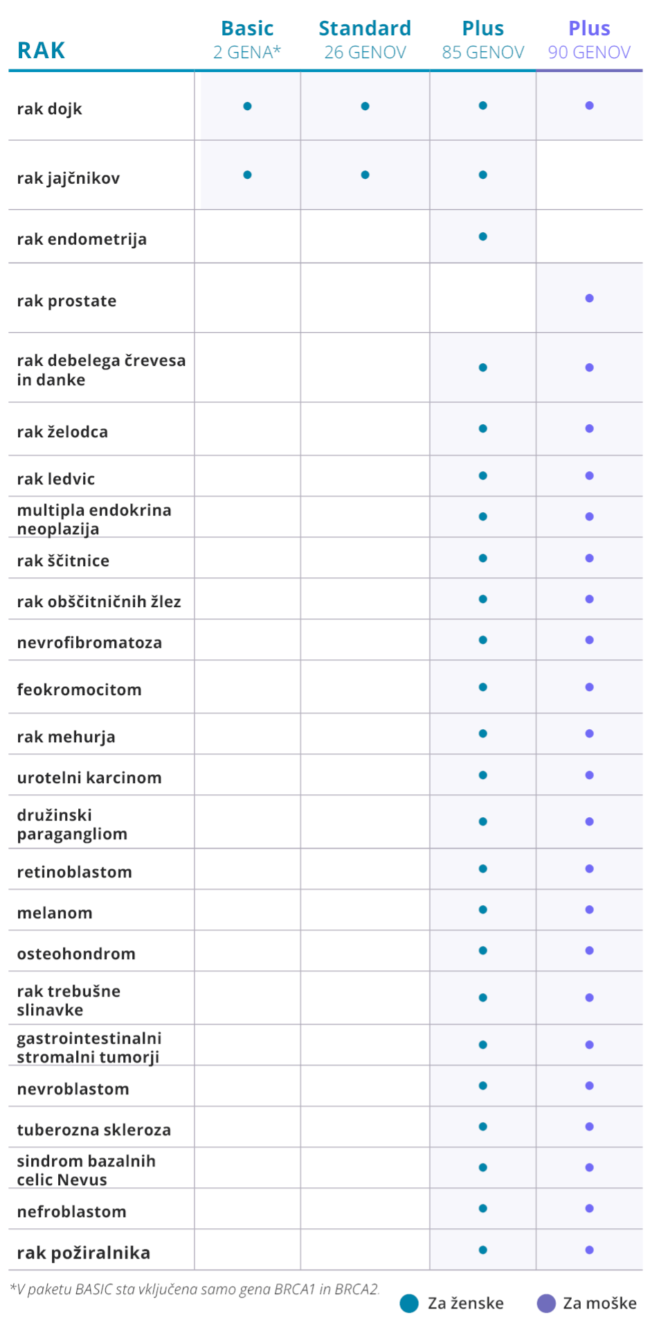 - Plus – določanje 90 različnih genov, ki so pomembni pri 25 različnih vrstah dednega raka – test je primeren za oba spola (test pri ženskah vključuje tudi vse gene, ki se določajo pri testu Standard).